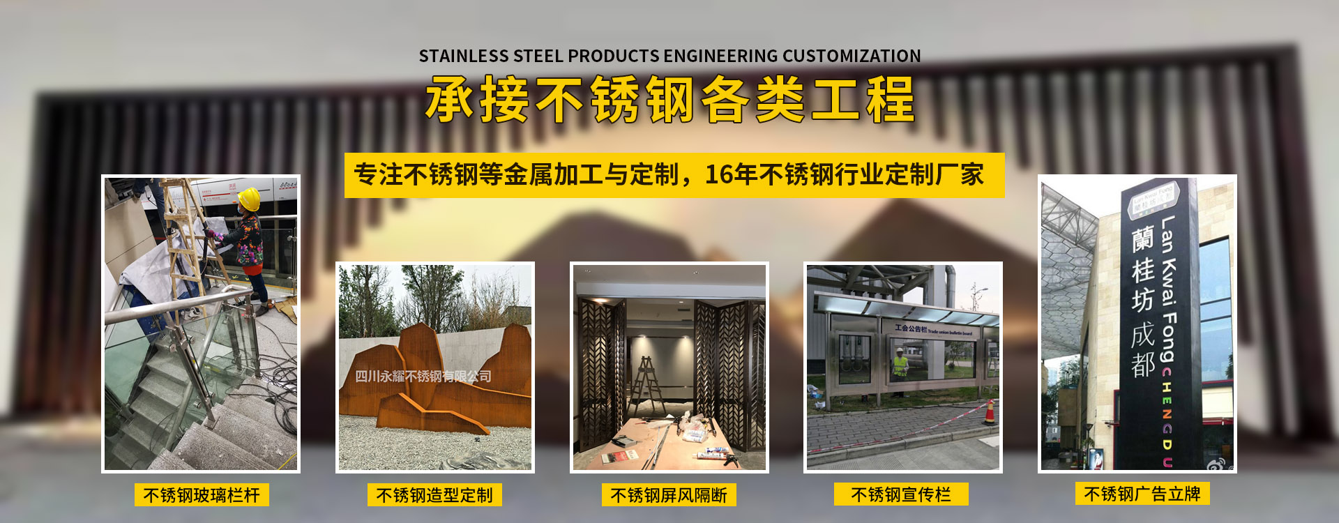 四川永耀不銹鋼有限公司是一家集開發、設計、加工、制作、安裝、并承接各種不銹鋼工程為一體的綜合性企業。多年來一直在專注于不銹鋼等金屬的加工與研發。在客戶群體中贏得了良好的聲譽,以專業專注的精神,致辭力于打造良好的產品和企業形象,對每一產品傾注全力,力爭每個細節精細,確保產品具有優越的性能,優美的外觀及優良的品質,使公司產品深受廣大用戶的親睞。 本公司主要業務: 一、工程類 承攬:酒店、銀行、商鋪、寫字樓、公寓、城鐵、地鐵、公交、機關、 學校、廣場藝術雕塑、自動門、旋轉門、廣告欄、公